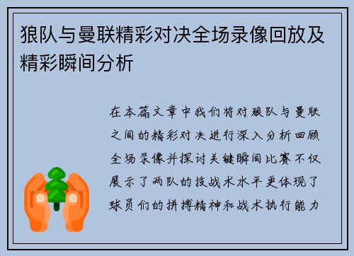 在本篇文章中,我们将对狼队与曼联之间的精彩对决进行深入分析,回顾全场录像并探讨关键瞬间。比赛不仅展示了两队的技战术水平,更体现了球员们的拼搏精神和战术执行能力。通过回放,我们将重点关注比赛进程、关键事件、球员表现以及战术安排等四个方面,为读者呈现一幅生动的赛场画面。无论是狼队的顽强防守还是曼联的快速...