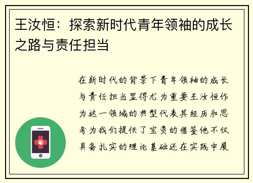 在新时代的背景下,青年领袖的成长与责任担当显得尤为重要。王汝恒作为这一领域的典型代表,其经历和思考为我们提供了宝贵的借鉴。他不仅具备扎实的理论基础,还在实践中展现出卓越的领导才能。本文将从四个方面探讨王汝恒如何探索新时代青年领袖的成长之路与责任担当,分别是:个人素质与能力提升、社会责任感的培养、团队...