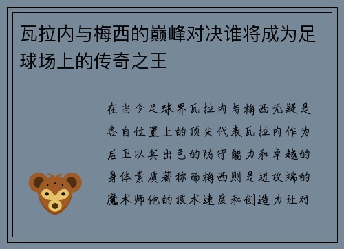 在当今足球界,瓦拉内与梅西无疑是各自位置上的顶尖代表。瓦拉内作为后卫,以其出色的防守能力和卓越的身体素质著称;而梅西则是进攻端的魔术师,他的技术、速度和创造力让对手闻风丧胆。两位球员在巅峰时期的表现,常常被拿来进行比较,他们的交锋不仅是技术与战术的较量,更是个人荣誉与球队成就的双重比拼。在这篇文章中...