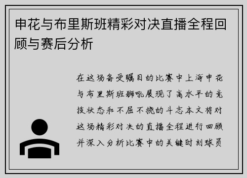 在这场备受瞩目的比赛中,上海申花与布里斯班狮吼展现了高水平的竞技状态和不屈不挠的斗志。本文将对这场精彩对决的直播全程进行回顾,并深入分析比赛中的关键时刻、球员表现、战术安排及赛后反响。通过这些方面,我们能够更好地理解比赛的走势和双方球队在赛事中的表现。同时,文章还将探讨申花与布里斯班两队在本次较量中...