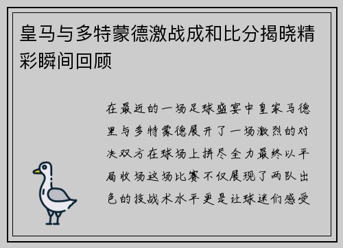 在最近的一场足球盛宴中,皇家马德里与多特蒙德展开了一场激烈的对决,双方在球场上拼尽全力,最终以平局收场。这场比赛不仅展现了两队出色的技战术水平,更是让球迷们感受到了足球运动的魅力。比赛过程中出现了多个精彩瞬间,无论是华丽的进攻配合还是稳健的防守反击,都令观众目不暇接。本文将从比赛前景、关键时刻、战术...