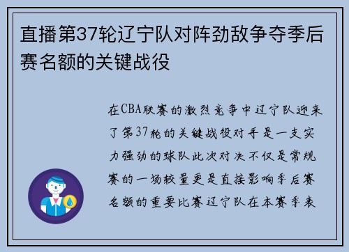 在CBA联赛的激烈竞争中,辽宁队迎来了第37轮的关键战役,对手是一支实力强劲的球队。此次对决不仅是常规赛的一场较量,更是直接影响季后赛名额的重要比赛。辽宁队在本赛季表现出色,但面对劲敌,他们必须全力以赴才能确保晋级的机会。本文将从比赛背景、球队状态、关键球员表现及未来展望四个方面详细分析这场至关重要...